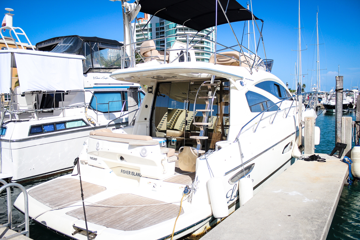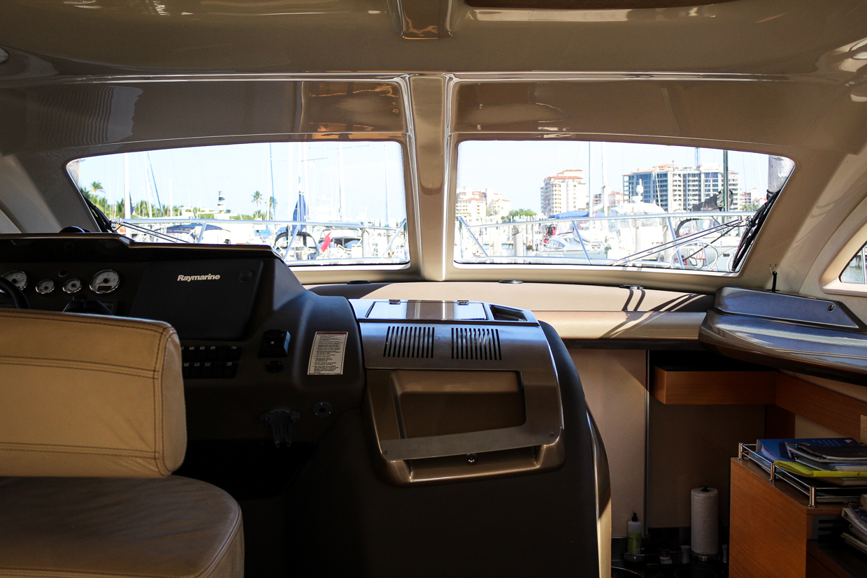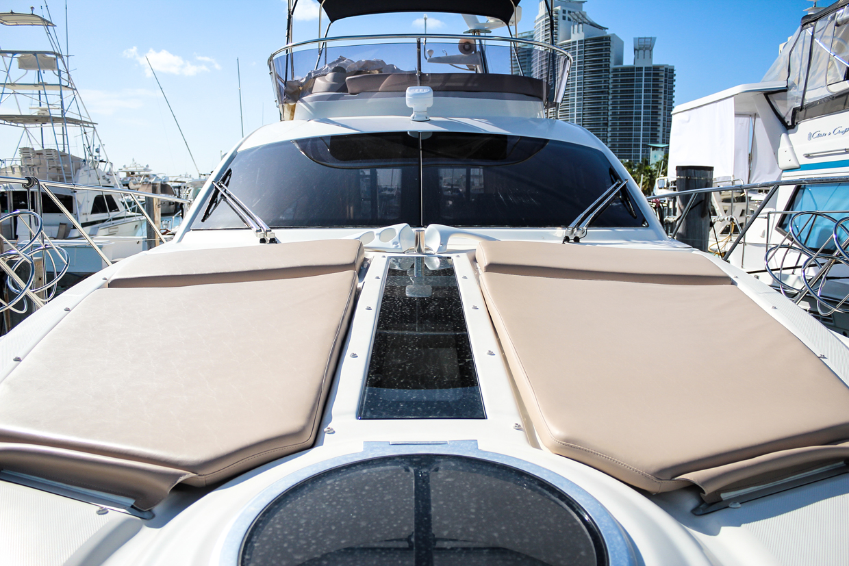 The cockpit features lush teak finishing; the fly-bridge features a dining table that converts to a lounge, a forward sunbed, and a captains station with room for two! The bow has two large sun pads with an attachable umbrella for shade. The sound system leaves no words for description, designed to be a concert hall on the water, its clarity next the waves will have you dancing to the sunset!