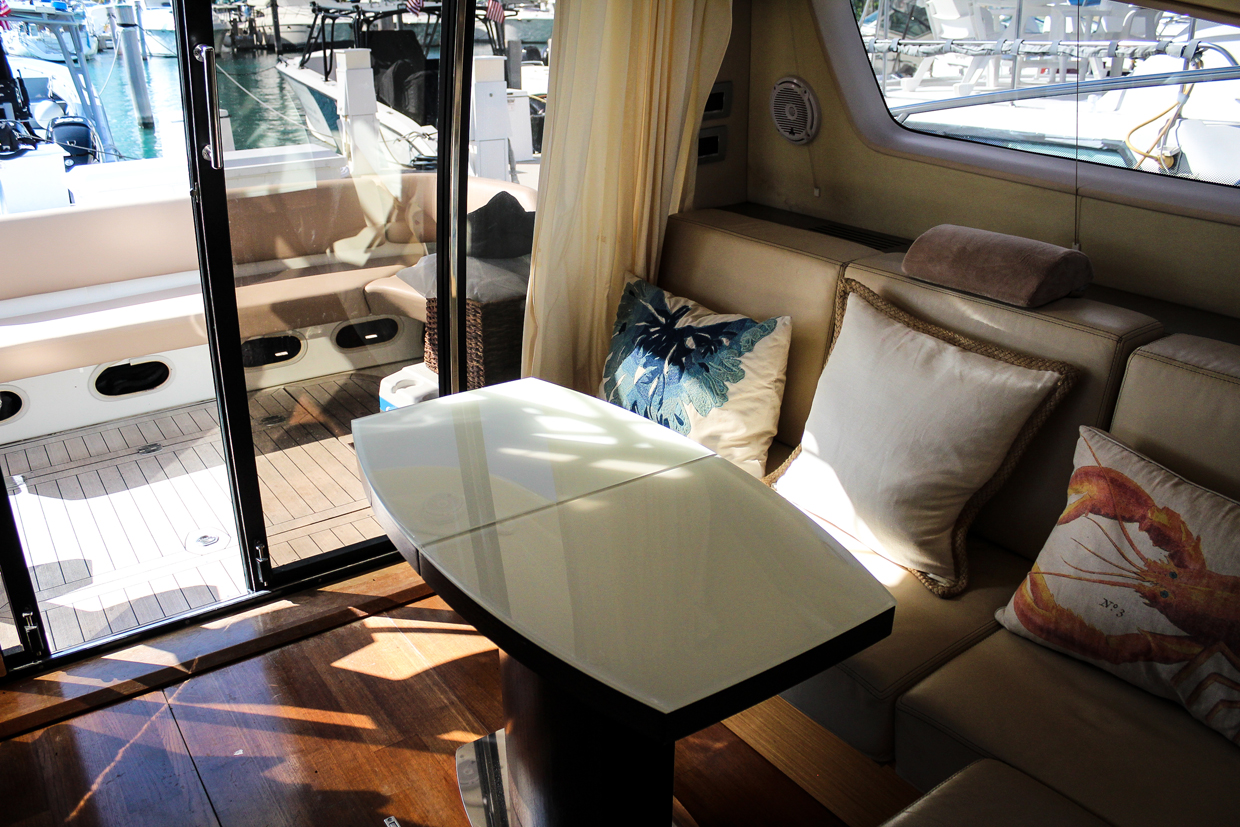 Sitting beneath the vast sliding hardtop roof is the main saloon and cockpit. When opened, natural light illuminates the interior allowing guests to indulge in the lavish surroundings.
